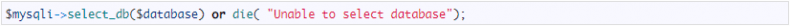 With the above PHP uses the MySQL connection and with it – selects the database stored in the variable $database (in our case it will select the database “your_database”). If the script cannot connect it will stop executing and will show the error message “Unable to select database”.