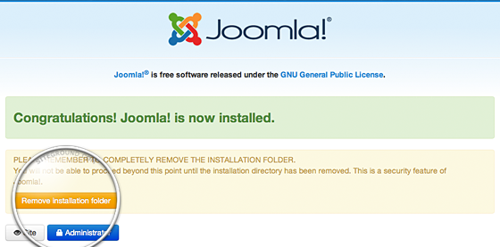 On the last screen of the installation process you need to press the Remove installation folder button. This is required for security reasons, so no one can reinstall your existing site later on. Note that Joomla won’t let you use your site unless you remove this folder completely!