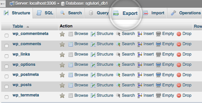 A new page will be loaded showing the structure of the selected database. To create a backup of the database, click the Export tab.