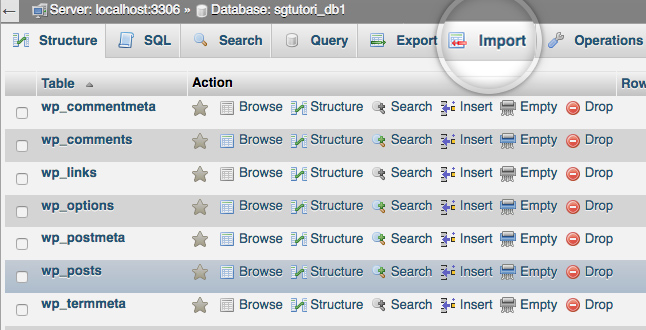 A new page will be loaded showing the structure of the selected database. To import data inside the database, click the Import tab.