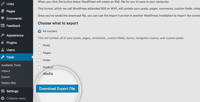 Then choose All content and click the Download Export File and you will be prompted to download an .xml file, which contains all the data from your WordPress.com blog.