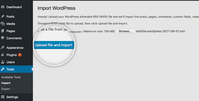 The plugin required for the import will be automatically installed, after which the Install Now button will change to Run Importer. Click that button and on the page that opens click Browse. Then a pop-up will show up and you must navigate and select the .xml file that you have downloaded from your wordpress.com blog earlier. Then click the Upload file and import button.