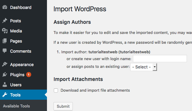 Since you will be inserting new posts and pages WordPress needs to know who will be their author. On the next page you can either select an existing user as posts author, or you can create a new one for the imported data. Note that you should check the Download and Import file attachments checkbox if you want your photos and other attachment to be transferred too. Finally, click on the Submit button.