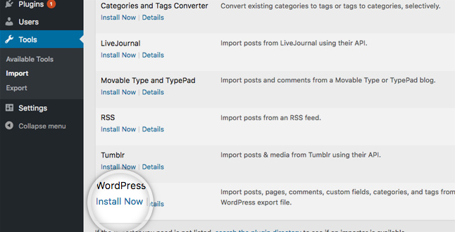 Now you need to import the information from the .xml file to your stand-alone WordPress installation. If you have one installed, login with your admin username and password. If you want to install a fresh WordPress application, check out the WordPress installation section for more information on how to do this. Once you login, select the Tools menu from the left column and chose Import. On the next page, click the Install Now button under the WordPress section at the bottom.