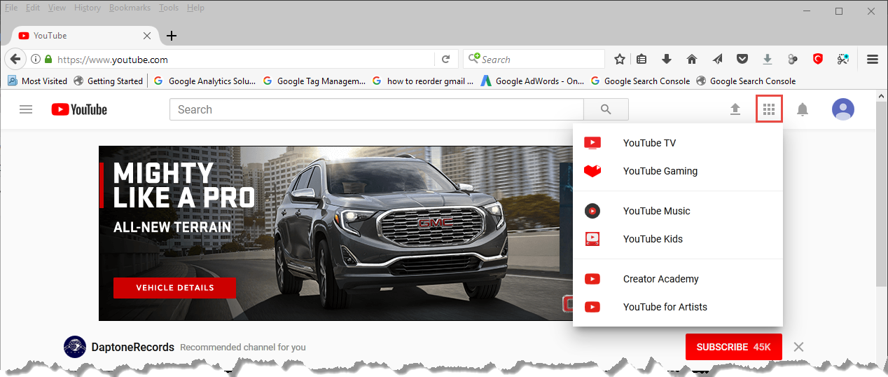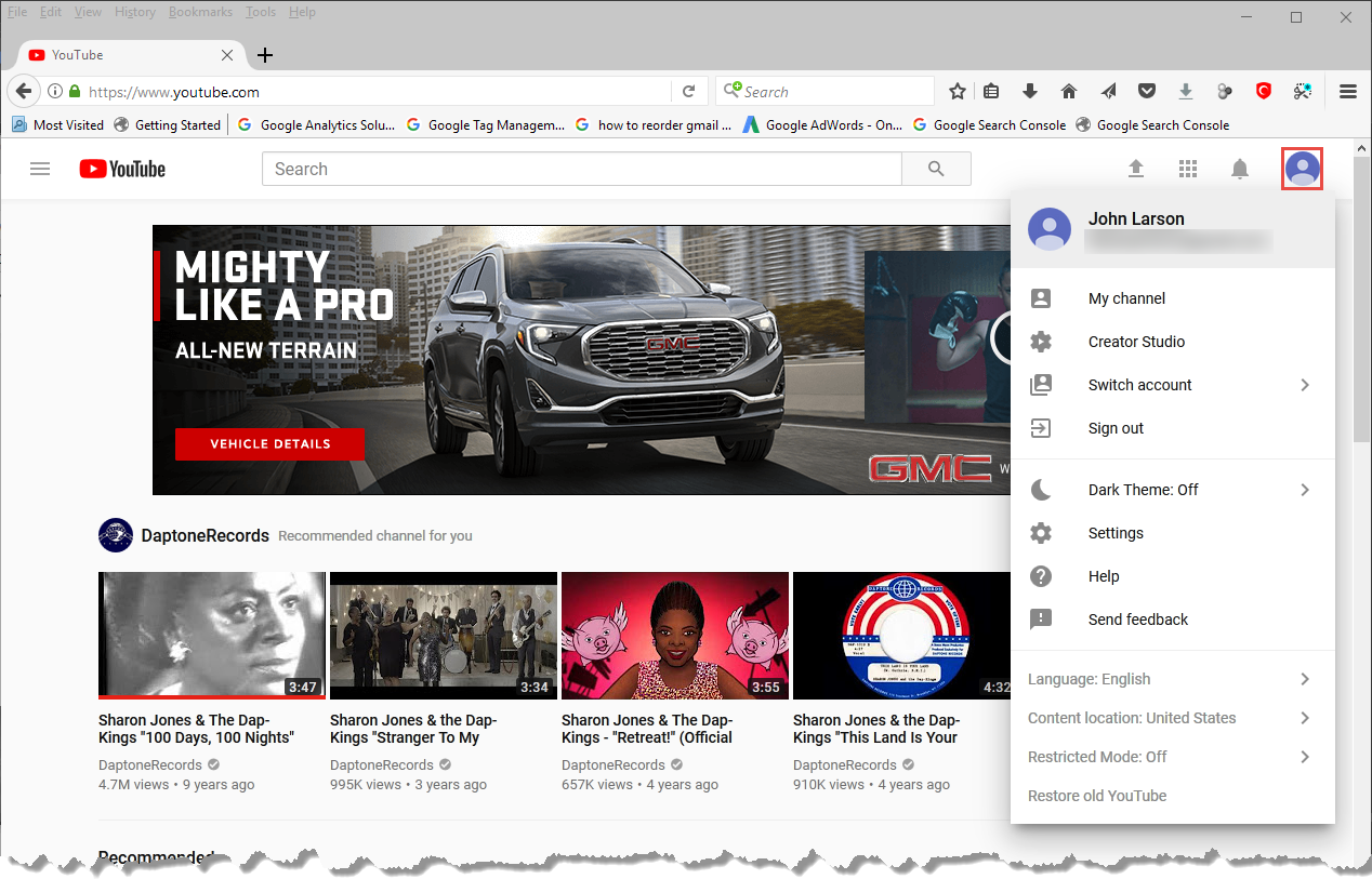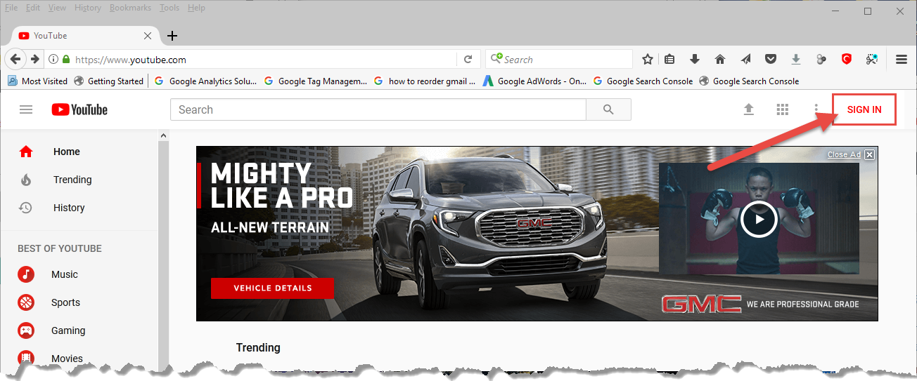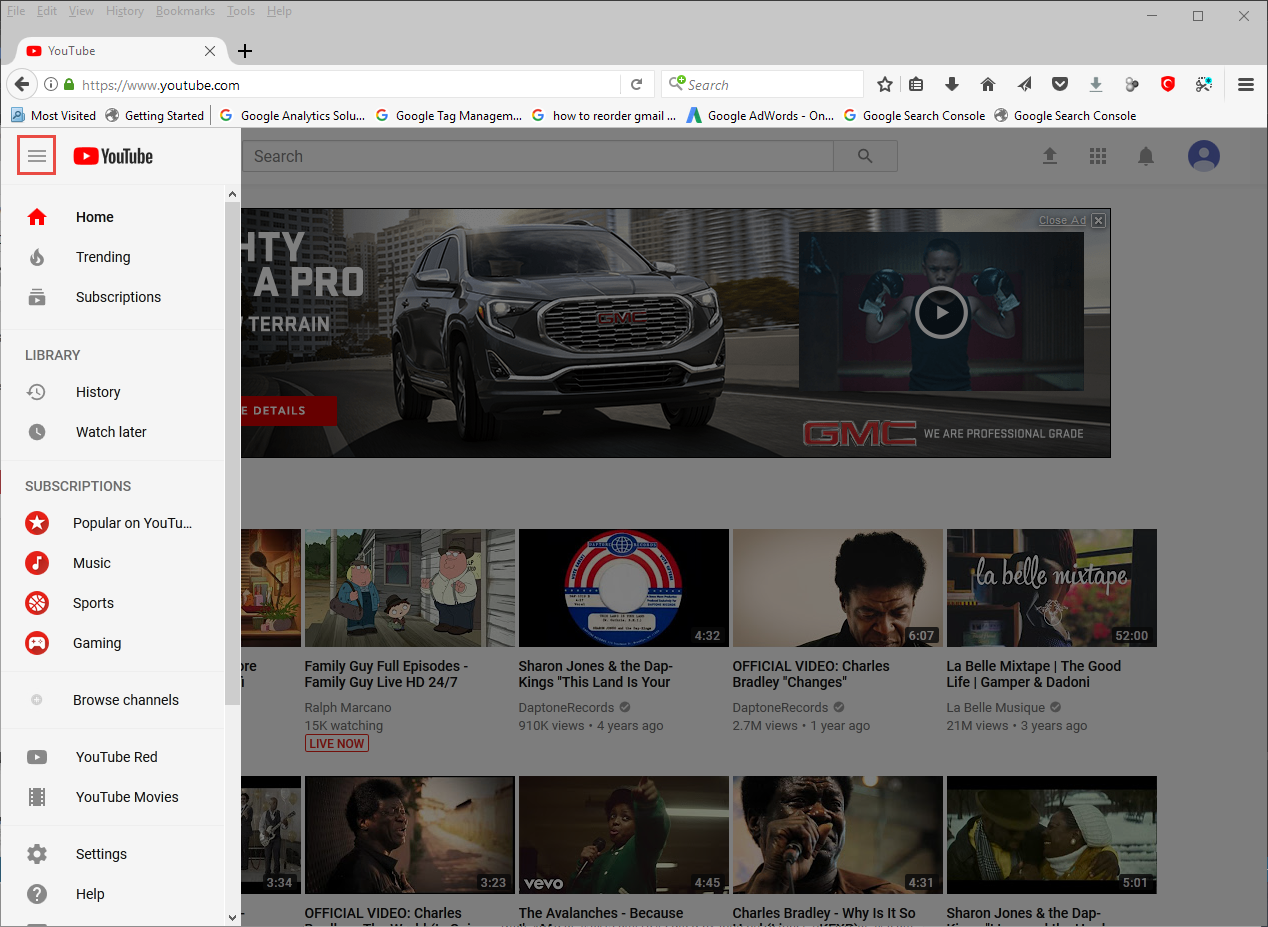 The YouTube navigation menu will give you access to trending videos, manage your subscriptions, view your history, browse channels, access premium YouTube options like Red or YouTube Movies, help, channel settings, and more.