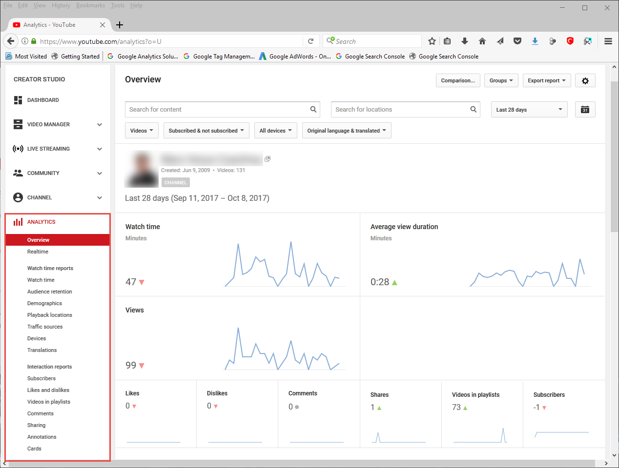 The Creator Studio controls allow you to manage your video content. You will access to uploading videos, video privacy settings, live streaming options, access to your channels, analytics, transcriptions, and tools to help create videos.