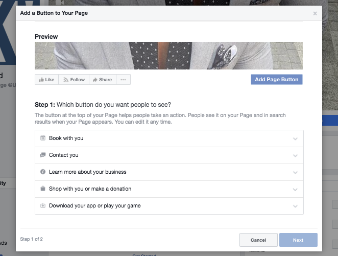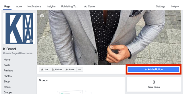 After you have input all of your important information into your Facebook business page, you will want to add a button to your page, which will appear in the top right-hand of your business page below your cover photo. This acts as your Facebook page’s call-to-action (CTA) and is free to use. Including a relevant one to your business can help generate more leads, and in return, increase sales. To do this, click the blue “+ Add a Button” option on the left-hand side of your page below your cover image.