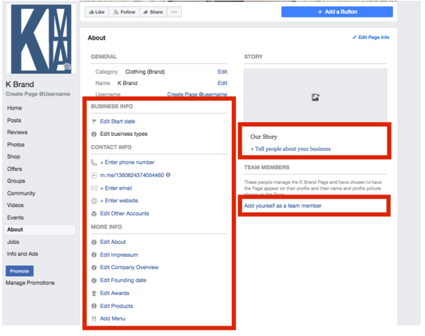 In the left-hand menu, find and select “About” section. This is where you will input information that tells readers about your business, from ways to contact you to your products or menu. Include a 2-3 sentence description for your company and enter all pertinent information, such as your website, hours, and contact information. This will be shown on your main page, so make it descriptive but brief and be sure to include a link to your company website as well. This information is what differentiates your business from everyone else so give some thought and make your page even more appealing to potential followers.