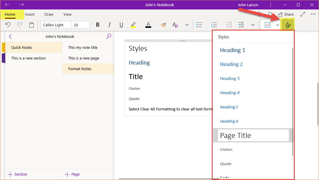 Select Styles to apply a Heading, Page Title, Citation, or Quote to your notes.