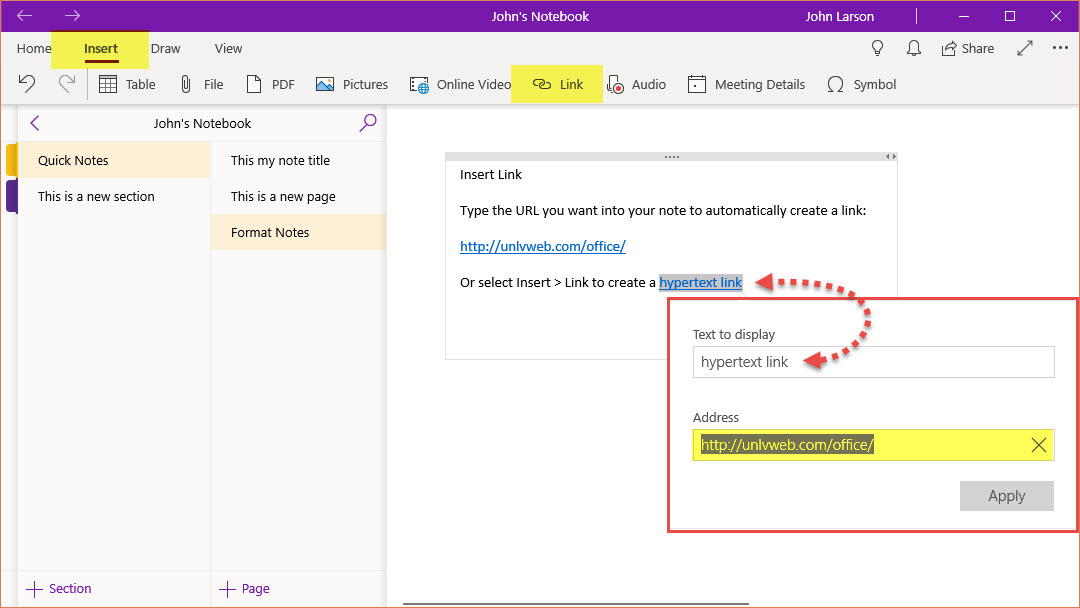 Type the address you want into your page to automatically create a link, or select Insert > Link.