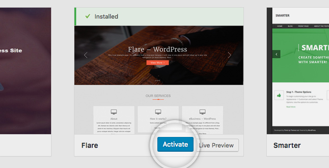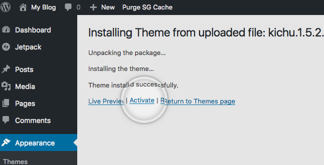 Your WordPress application will download and install the theme for you. Simply click the Activate button on the same page to activate the theme.