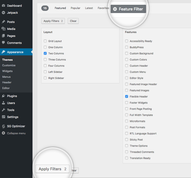 However, knowing the tags for the desired theme is not always the case. This is why, you can use the Feature Filter. For example, you can search for a Two columns theme that has Flexible header. Simply check those tags and press the Apply Filters button.