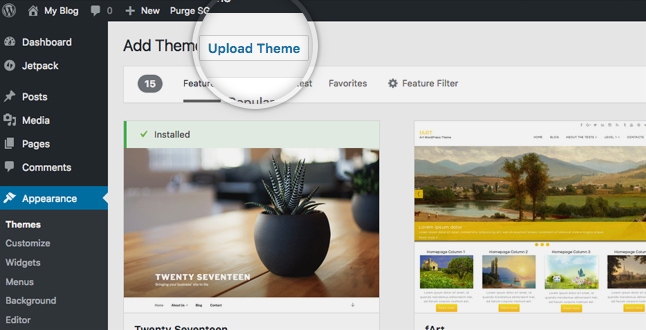 If you have a theme that’s not listed in the WordPress.org directory, you can simply upload it from the Themes > Install Themes section in WordPress. To do this click on the Upload Theme button at the top of the page.