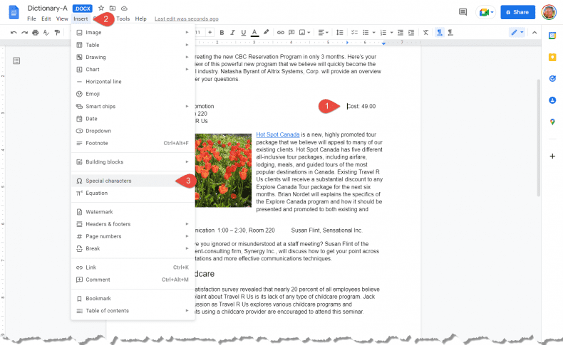 Google Docs allows you to insert special characters and symbols that are not found on your keyboard. These can include copyright (©) and trademark (™) symbols, foreign currency symbols (¥), mathematical symbols (÷), accented characters (ä), and additional punctuation marks (⁂). This can be useful for adding professional-looking formatting to your documents or for inserting characters that are not available on your keyboard.