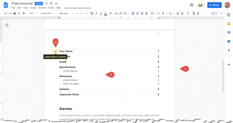The table of contents is inserted, listing all the headings in the document in outline order, as well as the page number that each heading appears on.
