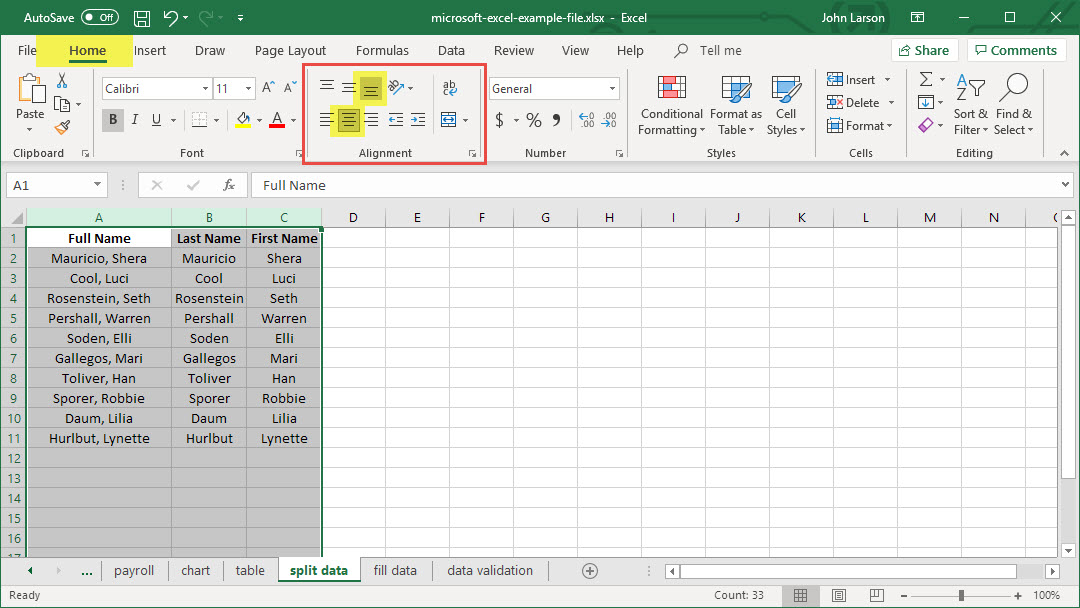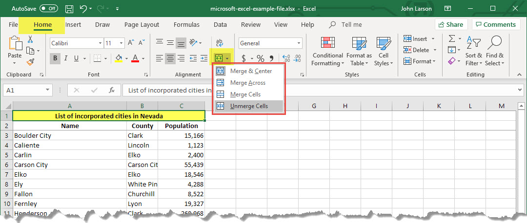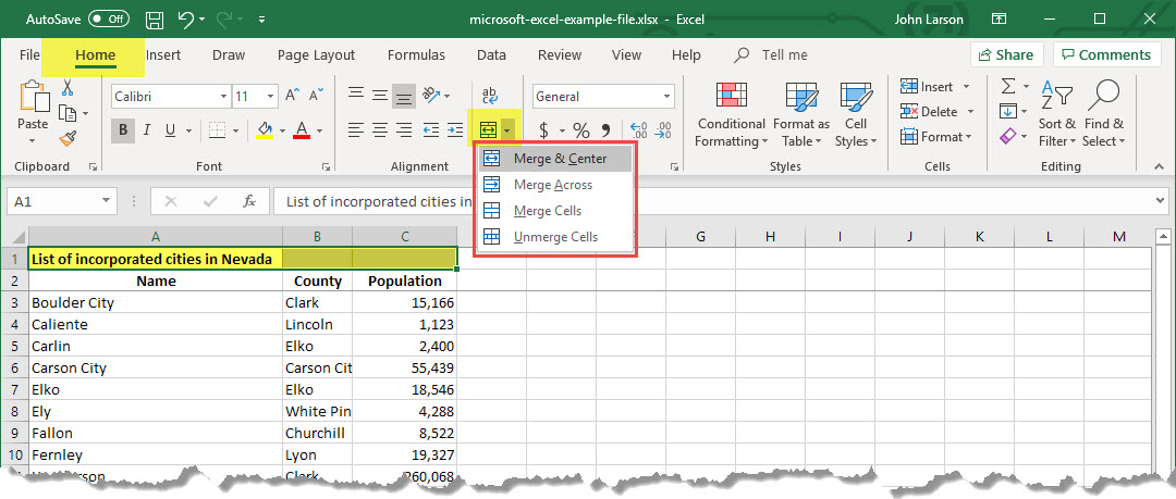 1. Select the Merge & Center down arrow.