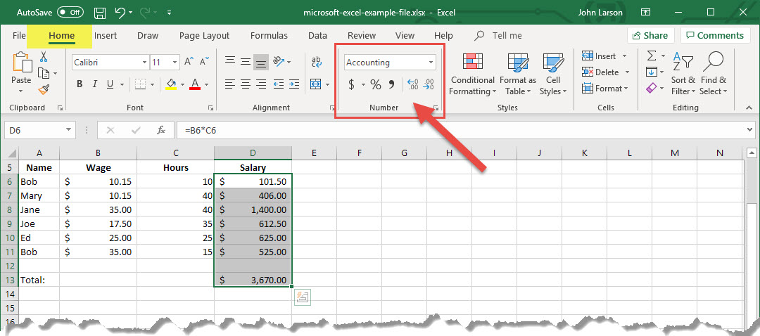 | Accounting | Also used for monetary values, but it aligns the currency symbols and decimal points of numbers in a column. |