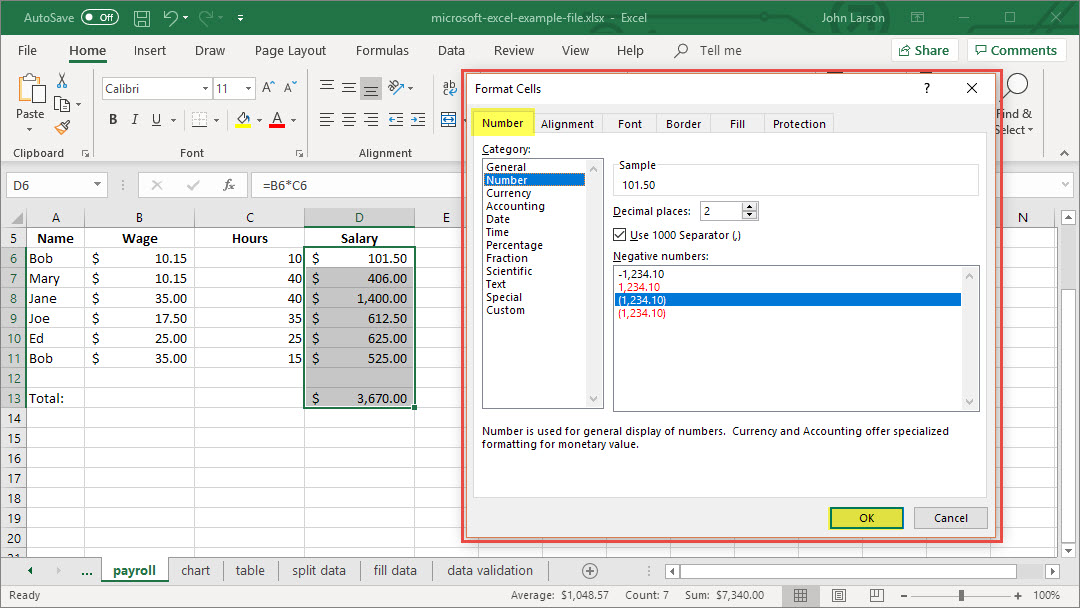 - Press Ctrl+1 and select Number.
