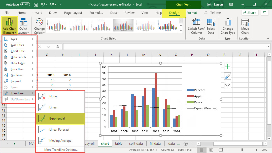 3. Select Trendline and then select the type of trendline you want, such as Linear, Exponential, Linear Forecast, or Moving Average.