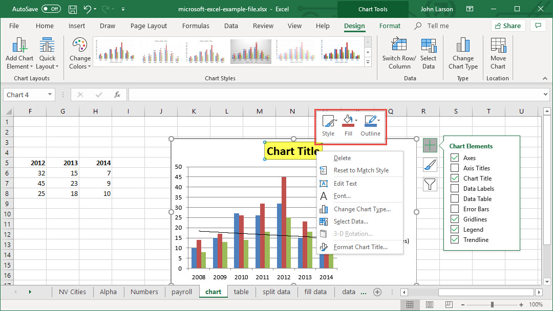 5. Right-click the chart title to format it. with options like Fill or Outline.