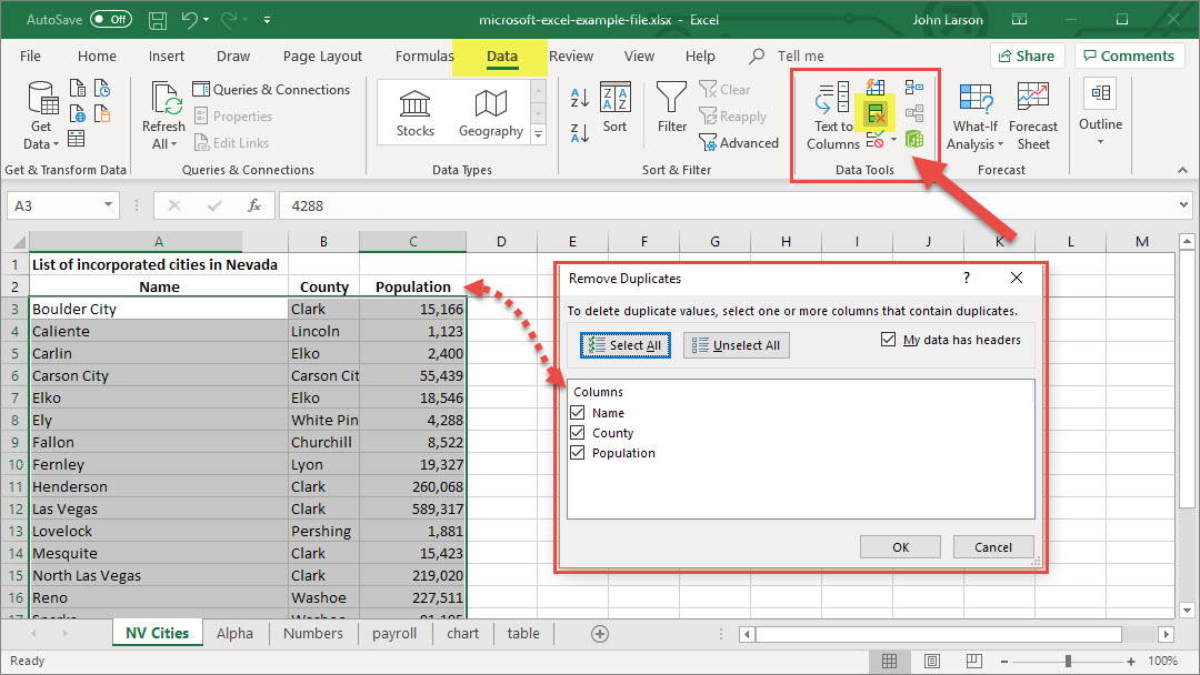 To remove duplicate values, click Data > Data Tools > Remove Duplicates.