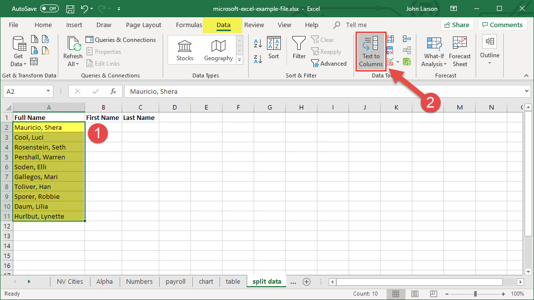 2. Select Data > Text to Columns.