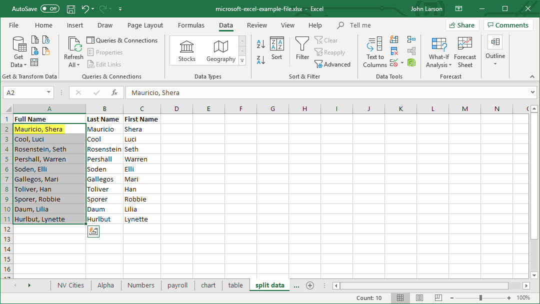 9. The contents from column A will be split into columns B and C.