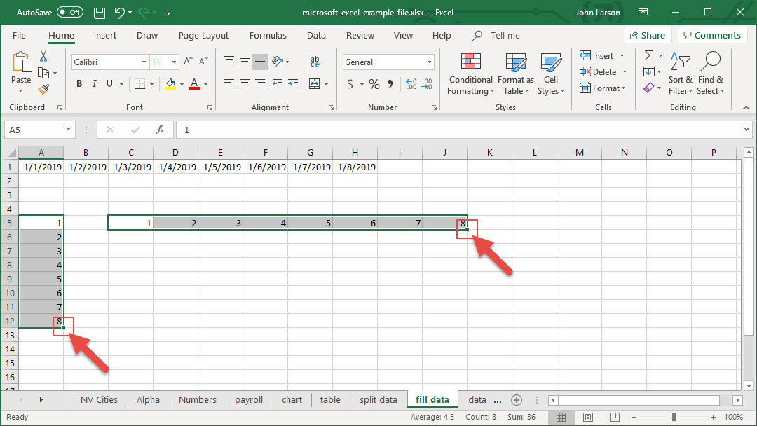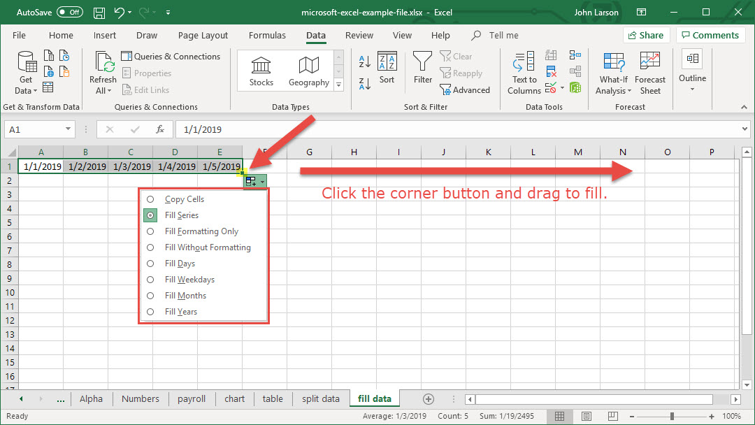 2. Select the fill handle at the lower-right corner of the cell, hold down, and drag to fill the rest of the series. Fill handles can be dragged up, down, or across a spreadsheet.