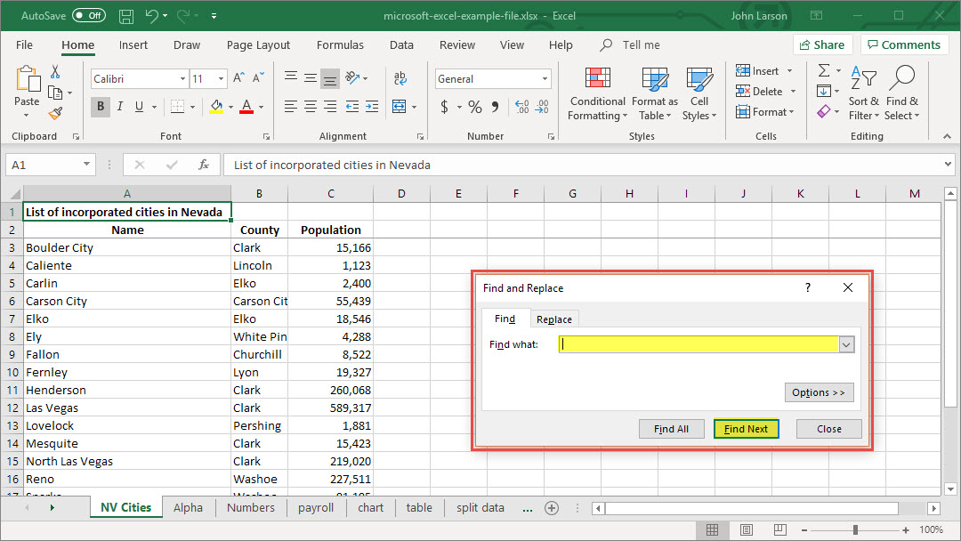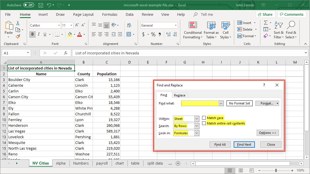 - To find text or numbers, click Find All or Find Next.