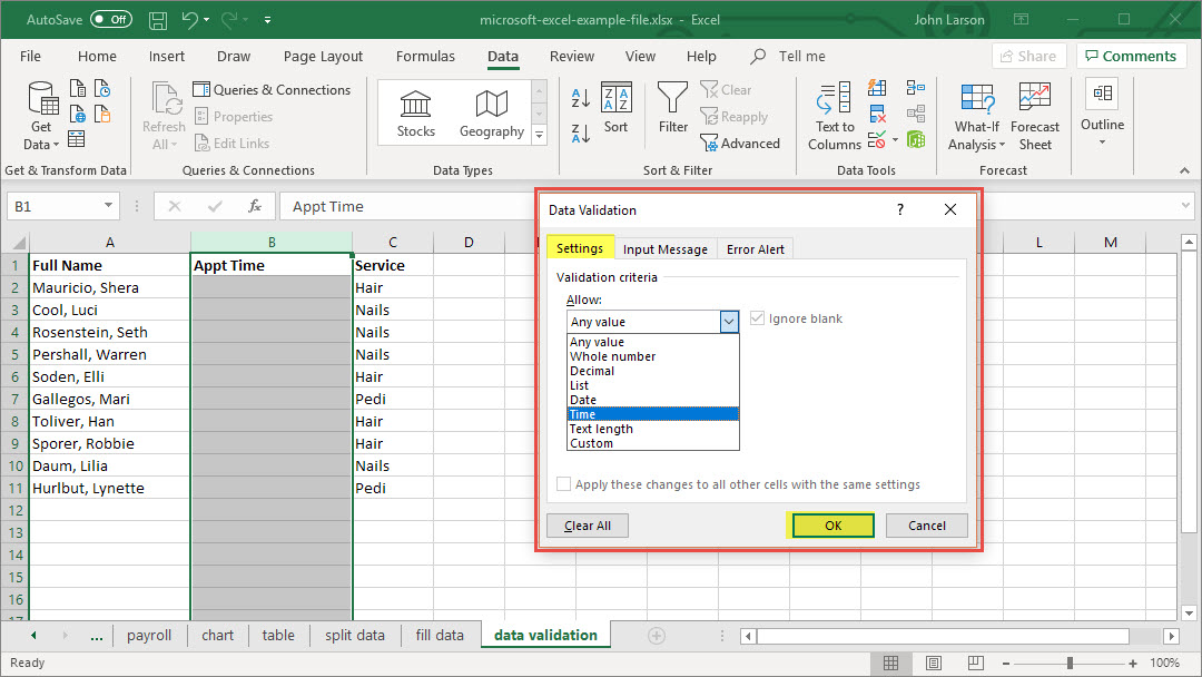 - Time – to restrict the cell to accept only time.