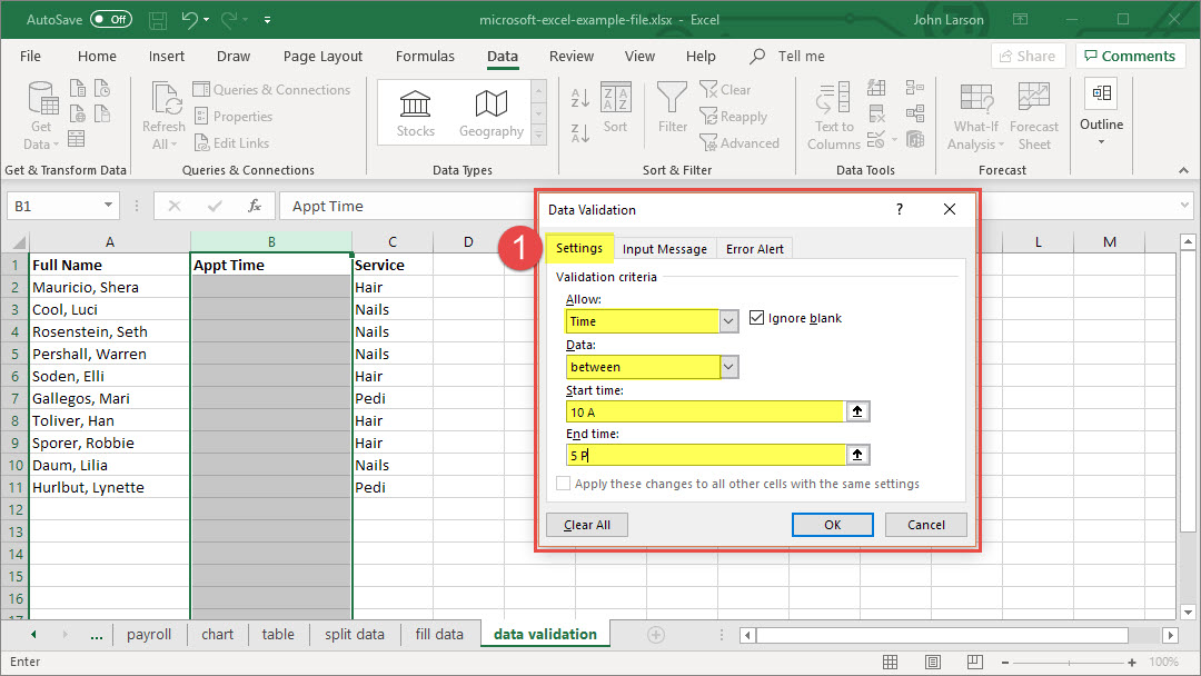 6. Set the other required values, based on what you chose for Allow and Data. For example, if you select between, then select the Minimum: and Maximum: values for the cell(s).