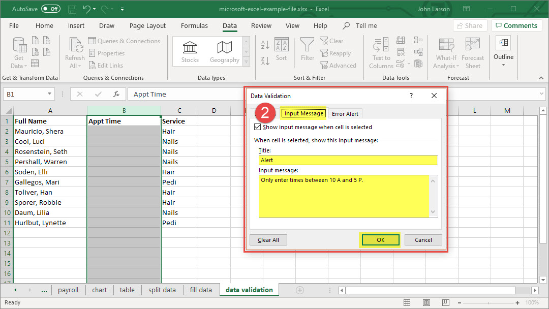 9. Select the Show input message when the cell is selected checkbox to display the message when the user selects or hovers over the selected cell(s).