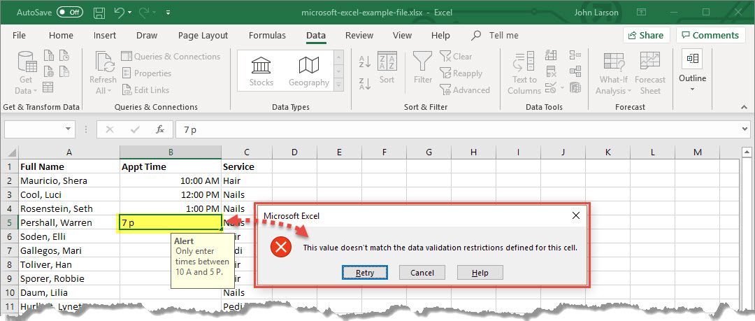 Now, if the user tries to enter a value that is not valid, a pop-up appears with the message, “This value doesn’t match the data validation restrictions for this cell.”