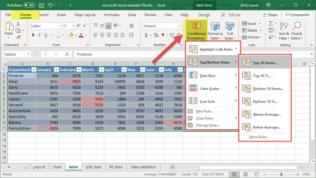 2. Select Conditional Formatting > Top/Bottom Rules > Top 10 Items to see the 10 largest numbers in the table.