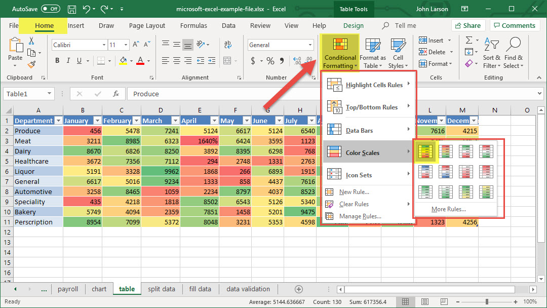 3. Select Conditional Formatting > Data Bars, Color Schemes, or Icon Sets to see how your data can be instantly analyzed. Press Ok when done.