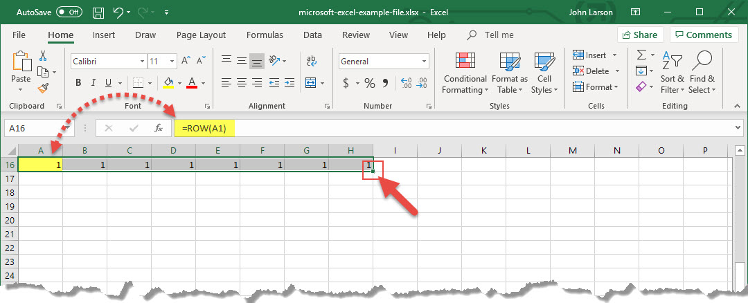 The ROW function returns the number of the row that you reference. For example, =ROW(A1) returns the number 1.