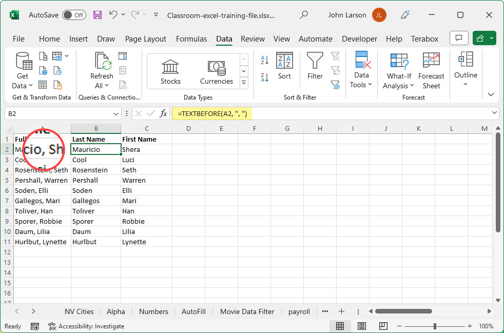 To split the second name in the list located in cell A2 (column A), we need to extract all text after the last occurrence of a “comma-space” character set. The formula would be: