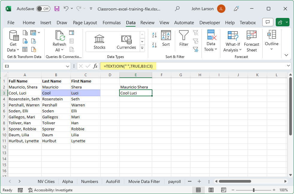 To join the first name (column B) and second name (column C) using the TEXTJOIN function, we would use a formula like this: