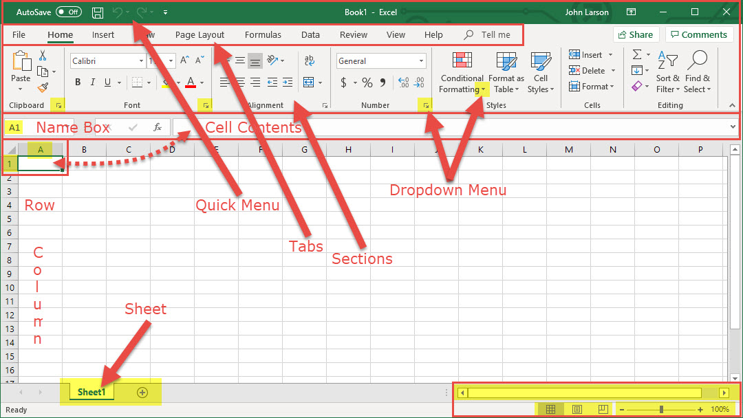 Below the ribbon is information about your location within the sheet (Name Box) and Cell Contents.