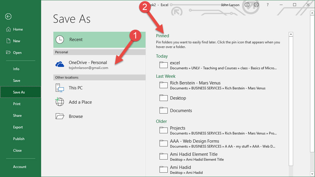 The first time you save your sheet you will need to 1. select a folder path and 2. create a file name. Excel will remember these settings and use them in the future.