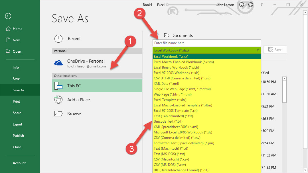 Excel can save files in a variety of formats, including previous versions of Excel, CSV, PDF, Macintosh versions of Excel, and more.