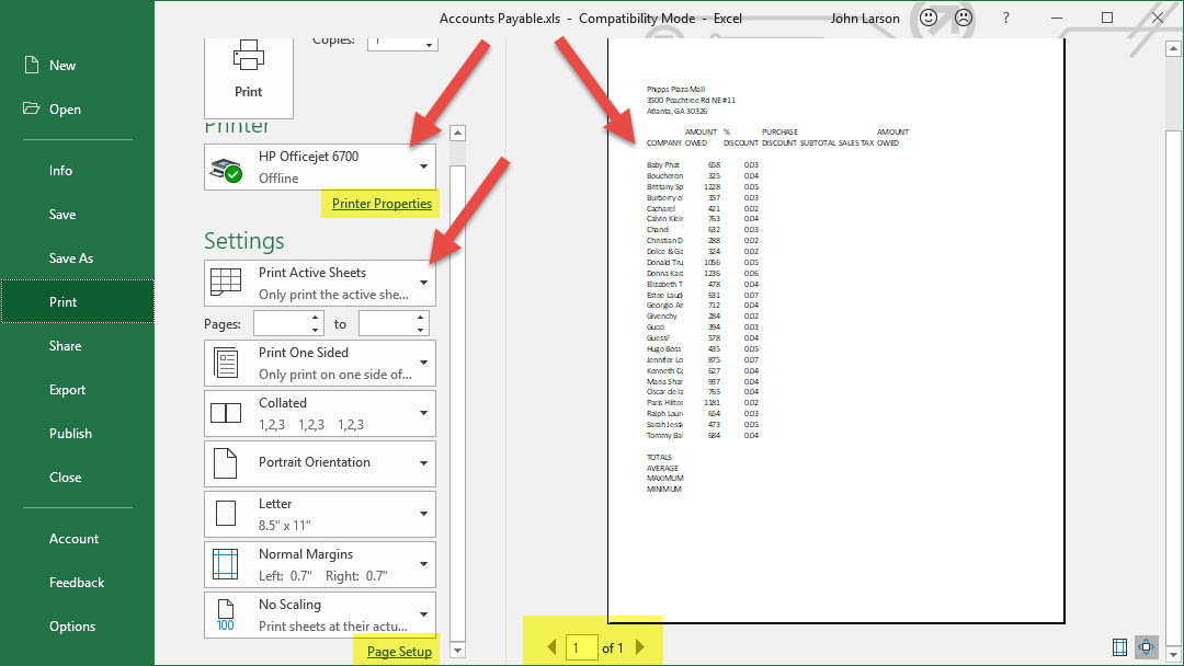 Printing Excel sheets is like Word. From the Print Dashboard, select the printer you want to use, and configure any print settings you want to adjust.