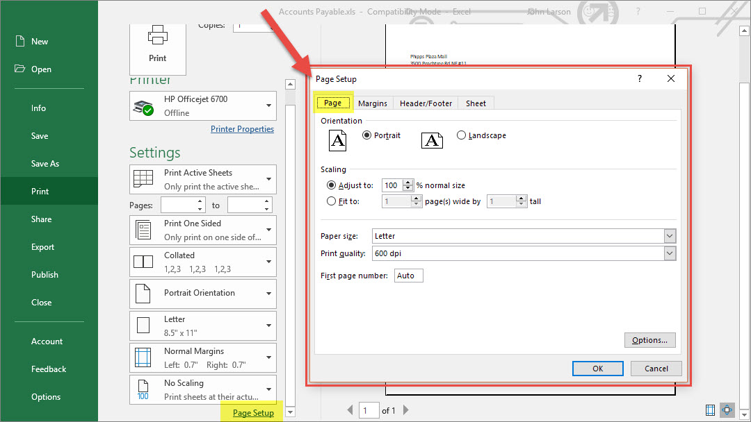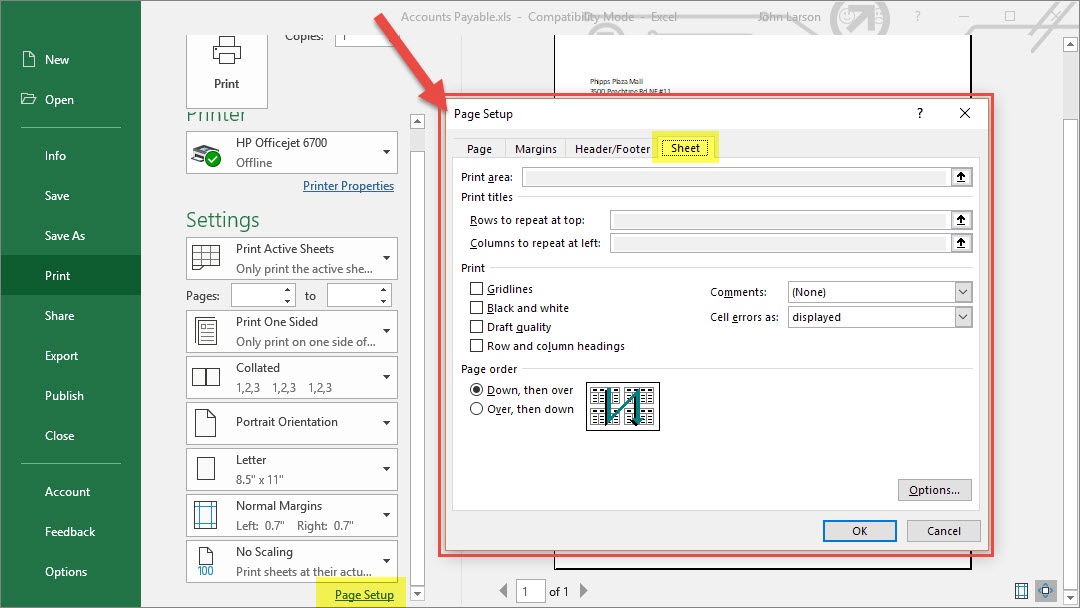 Excel spreadsheets can be massive and you don’t always want to print everything in your sheet. The Sheet / Page Setup options allow you to specify the print area, add gridlines, print quality, row and column headings, and print page order.