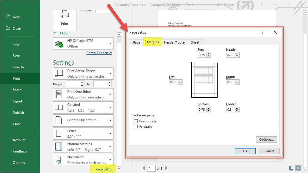 Margins control the white space around the edges of the sheet, and control the centering page (horizontally and vertically).