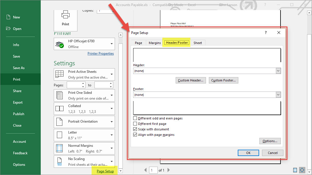 1. Select File > Print (or Ctrl+P) Edit Page Setup button to access options.