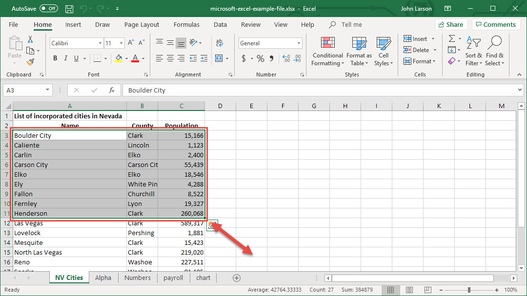 To select a range, select a cell, then hold the right bottom edge and drag over the cell range. Or use the Shift + arrow keys to select the range.