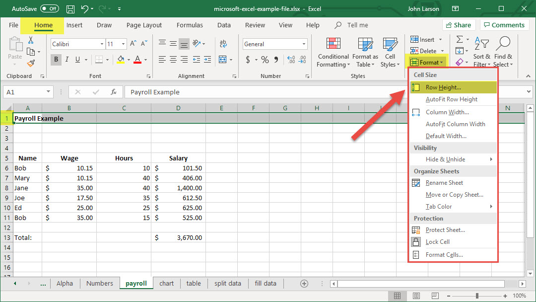 To insert a row, select the row, select Home > Insert > Insert Sheet Rows.