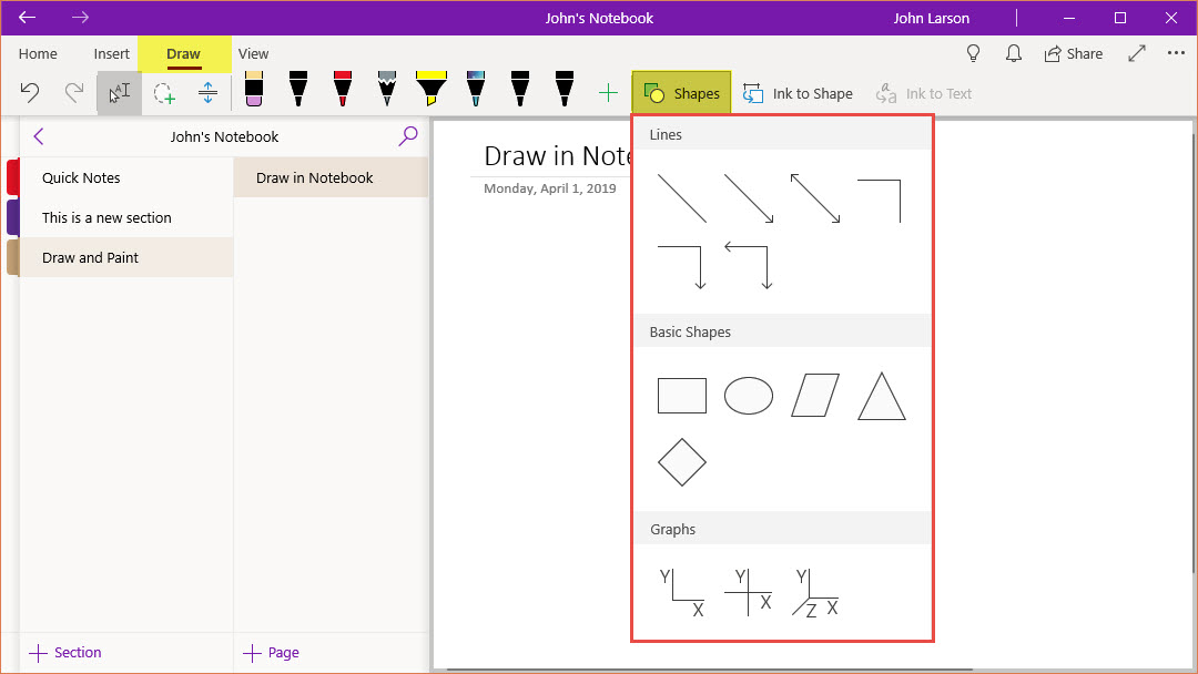 With OneNote, you can insert shapes, like a circle, triangle, or rectangle, or even draw shapes with your finger, pen, or mouse, and OneNote will automatically clean them up for you.