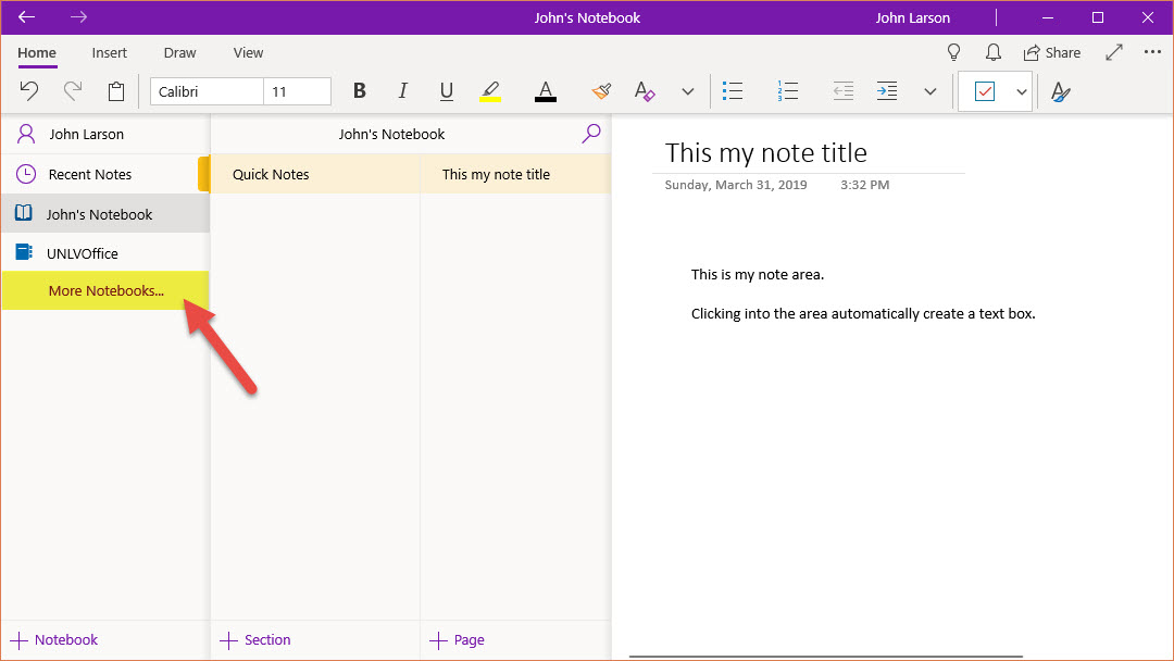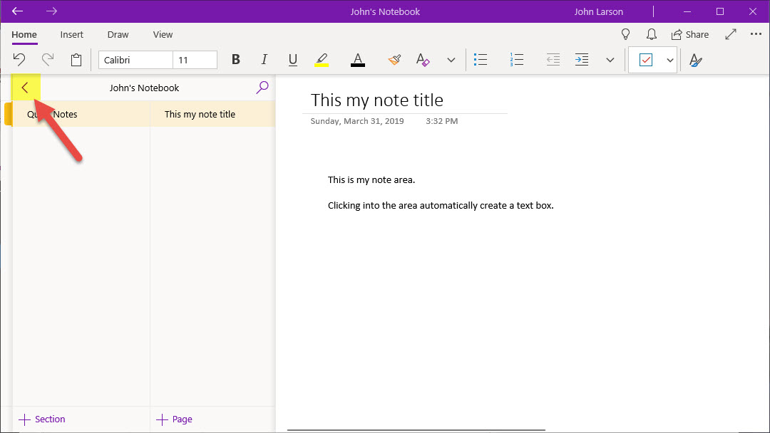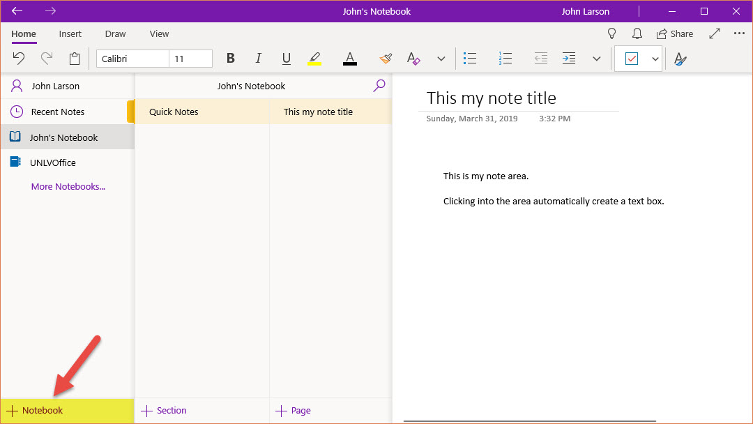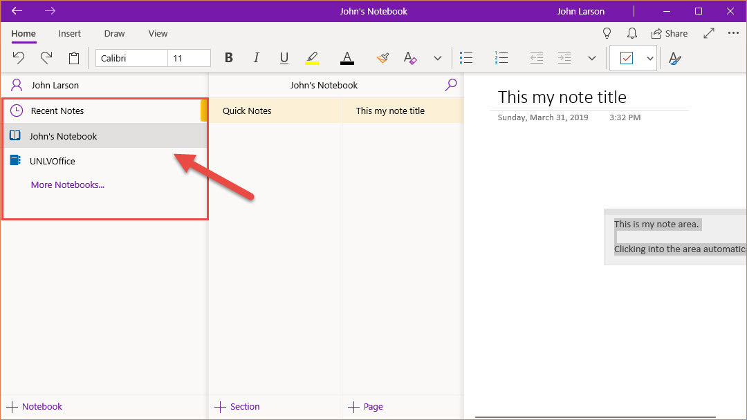 On the left-hand side, you have navigation to access to other notebooks, view subsection, create section, and pages.