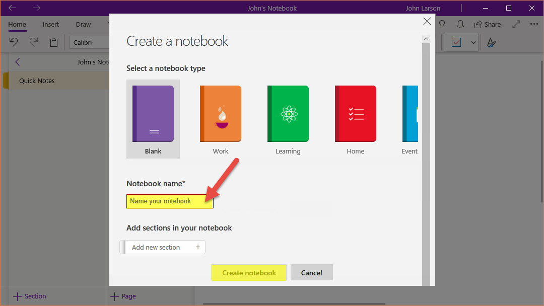 4. Type a name for the notebook in the Notebook Name box.